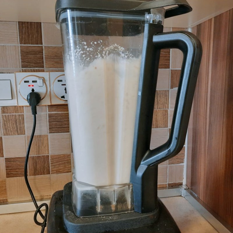 Cho hạt vào máy xay sinh tố, mỗi lần dùng 600ml nước nóng và chia làm 2 lần xay để hỗn hợp mịn hơn.