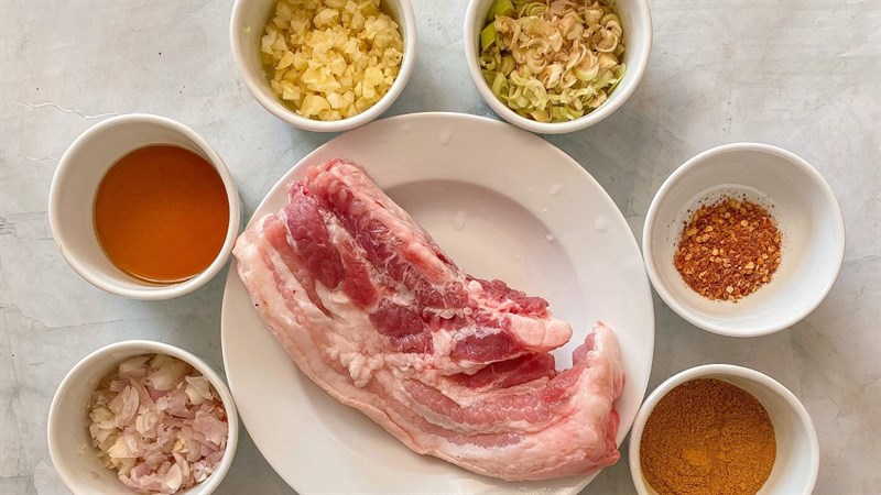 Thịt rửa sạch, để ráo và cắt miếng vừa ăn. Tỏi, hành, sả băm nhuyễn.