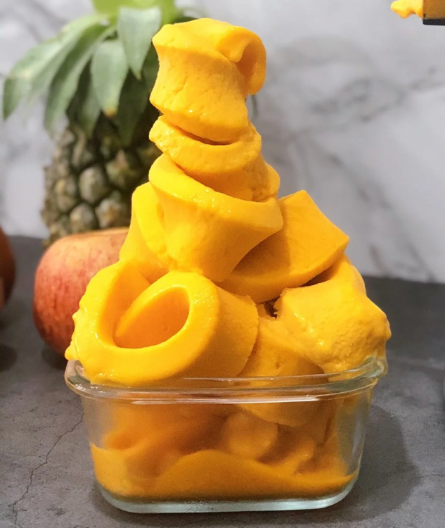 👉 Thành phẩm: Kem xoài mịn – dẻo – thơm tự nhiên, không cần thêm đá hay phụ gia.