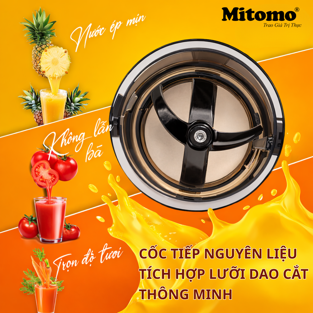 Một trong những điểm nổi bật của máy ép trái cây chậm Mitomo KJ-3081 chính là cốc tiếp nguyên liệu tích hợp lưỡi dao cắt thông minh.