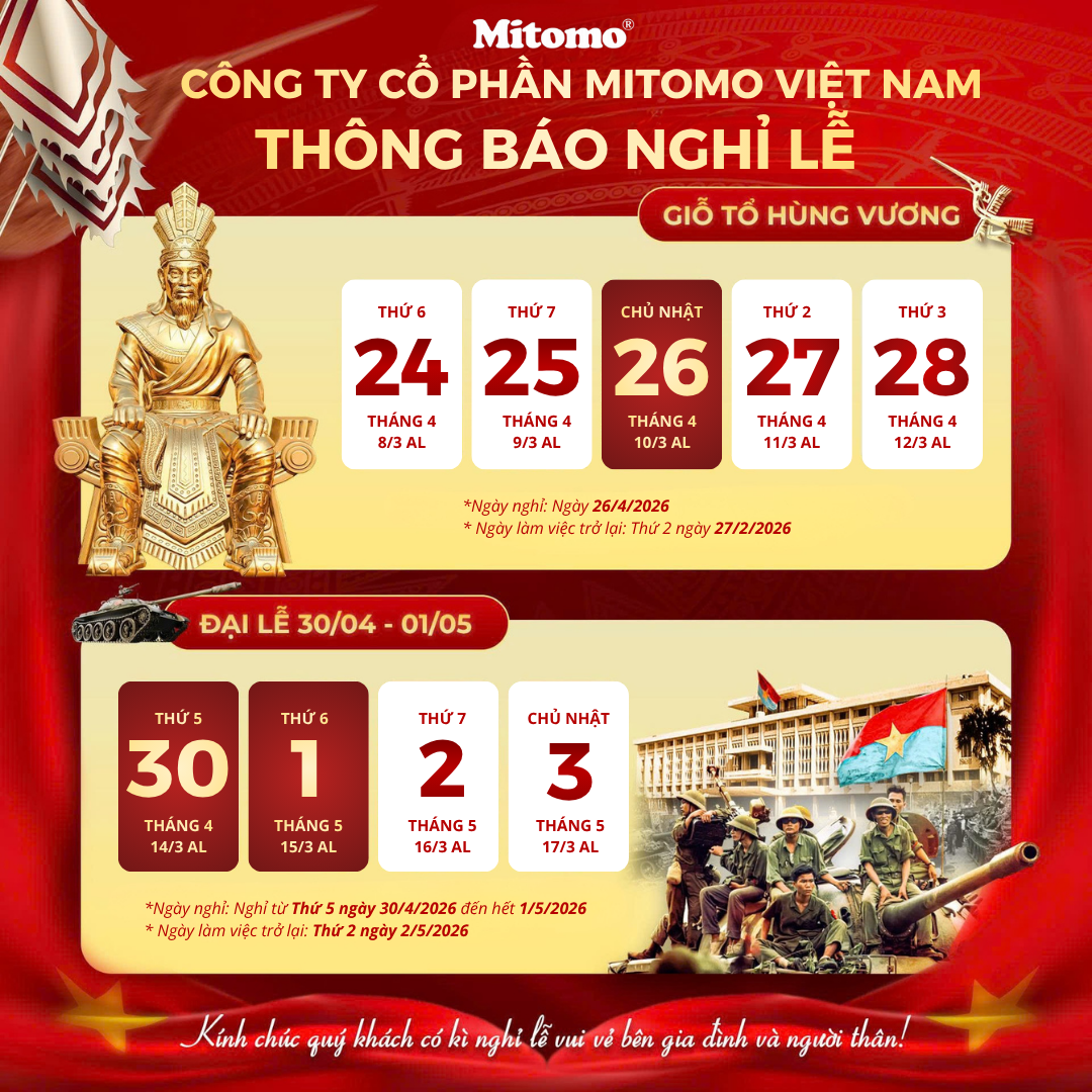 Công ty Cổ phần Mitomo Việt Nam (Mitomo) xin thông báo đến Quý Khách hàng và Quý Đối tác Lịch nghỉ lễ Giỗ tổ Hùng Vương và Giải Phóng Miền Nam 30/4 & Ngày Quốc tế Lao Động 1/5 năm 2026. Lịch nghỉ lễ như sau: