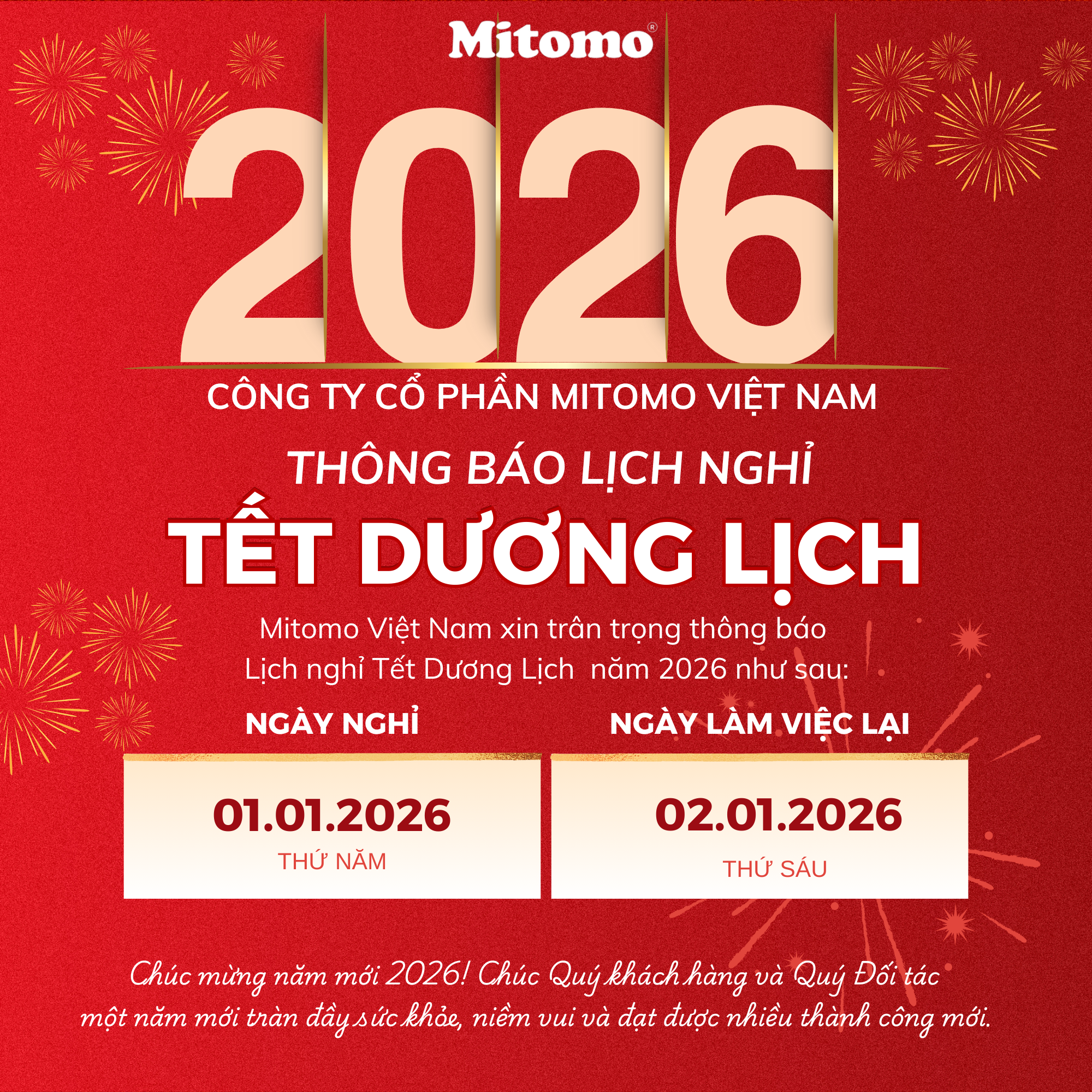 Công ty Cổ phần Mitomo Việt Nam (Mitomo) xin thông báo đến Quý Khách hàng và Quý Đối tác lịch nghỉ lễ Tết Dương Lịch năm 2026 như sau: