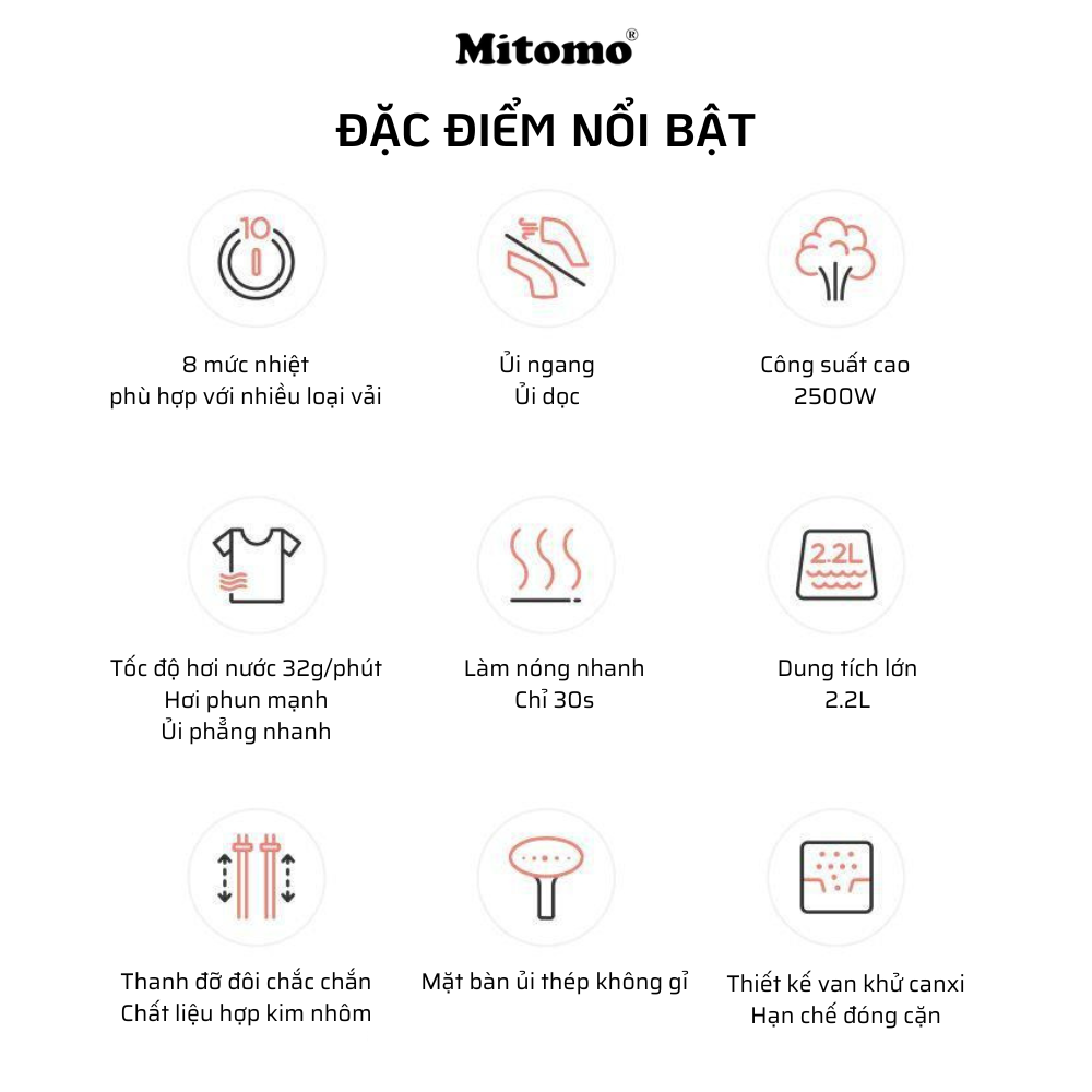 Model: GC-899Max Màu sắc: Ghi xám & Hồng nhạt Thương hiệu: Mitomo Xuất xứ thương hiệu: Việt Nam Điện áp: 220V/50Hz Dung tích bình chứa: 2.2L Chất liệu: Thép không gỉ và nhựa ABS cao cấp, Hợp kim nhôm Chiều cao tối đa: 154cm Công suất: 2500W Trọng lượng: 5.5Kg Bảo hành: 3 năm