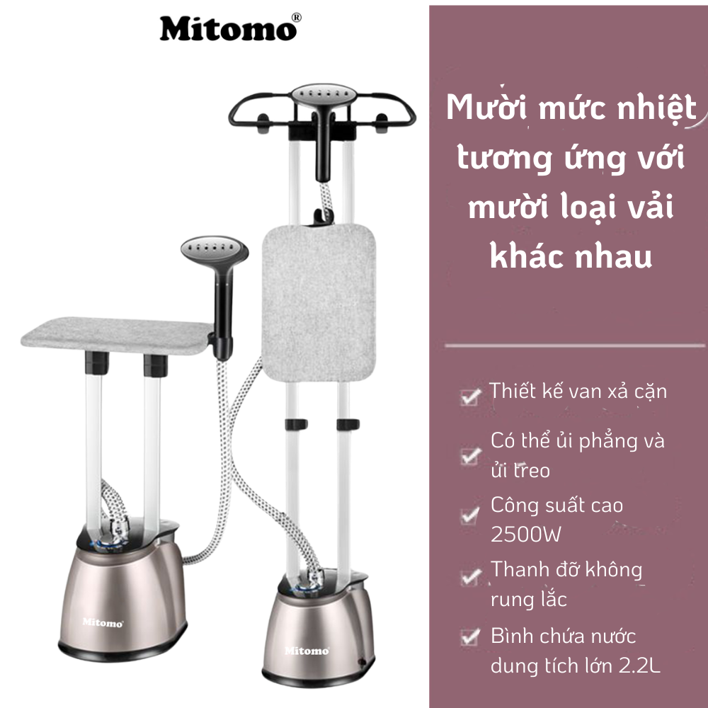 Model: GC-899Max Màu sắc: Ghi xám & Hồng nhạt Thương hiệu: Mitomo Xuất xứ thương hiệu: Việt Nam Điện áp: 220V/50Hz Dung tích bình chứa: 2.2L Chất liệu: Thép không gỉ và nhựa ABS cao cấp, Hợp kim nhôm Chiều cao tối đa: 154cm Công suất: 2500W Trọng lượng: 5.5Kg Bảo hành: 3 năm