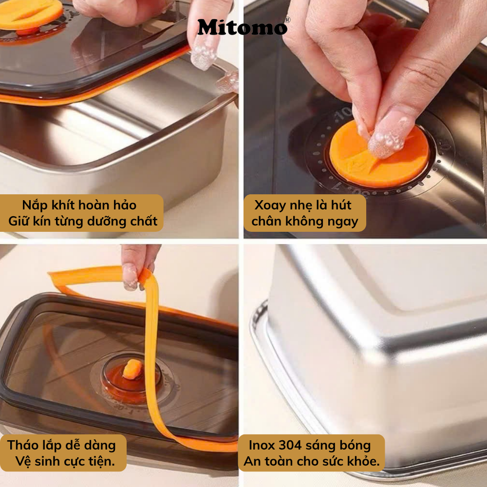 Hộp bảo quản inox 304 hình chữ nhật Mitomo được làm từ chất liệu inox 304 chuẩn cao cấp, chống gỉ rét, không bám mùi, an toàn tuyệt đối cho sức khoẻ gia đình.
