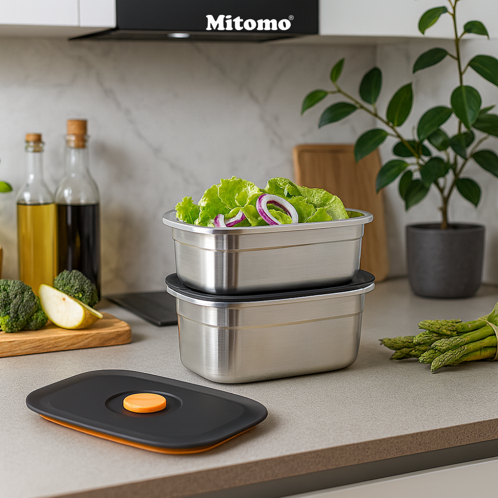 Bộ 2 hộp bảo quản thực phẩm Inox 304 hình chữ nhật Mitomo được dùng để lưu trữ, bảo quản thực phẩm khô, thực phẩm tươi sống hay thực phẩm chín.