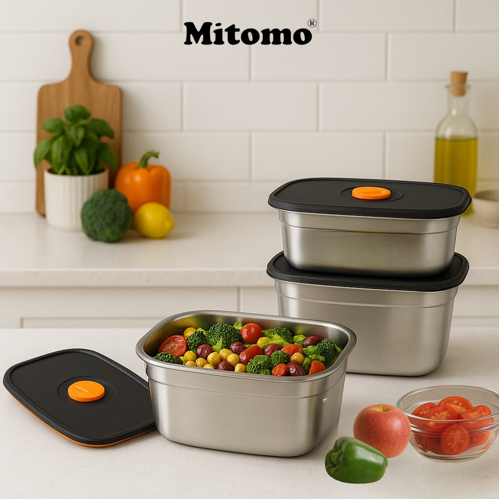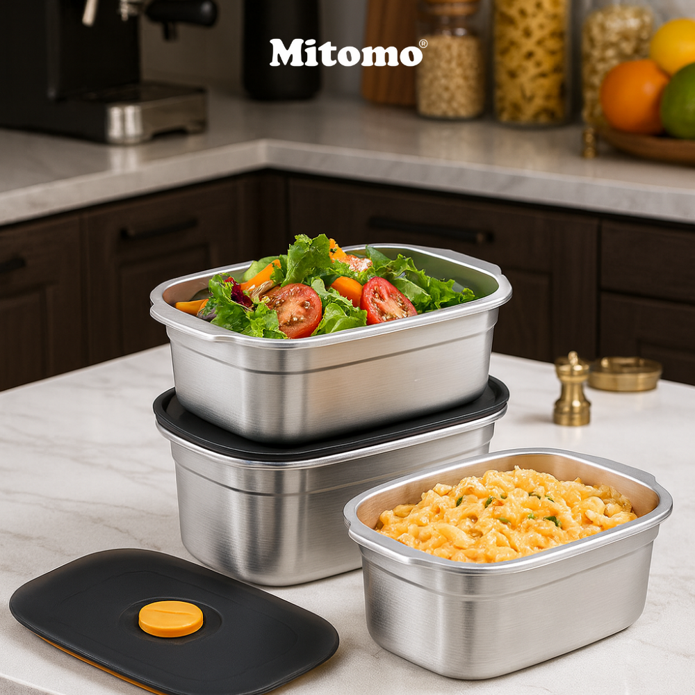 Với chất liệu inox 304 cao cấp này, hộp thuỷ tinh đựng thực phẩm Mitomo có thể sử dụng an toàn trong tủ lạnh, nồi chiên không dầu, lò nướng và vệ sinh trong máy rửa bát thoải mái giúp tiết kiệm thời gian.