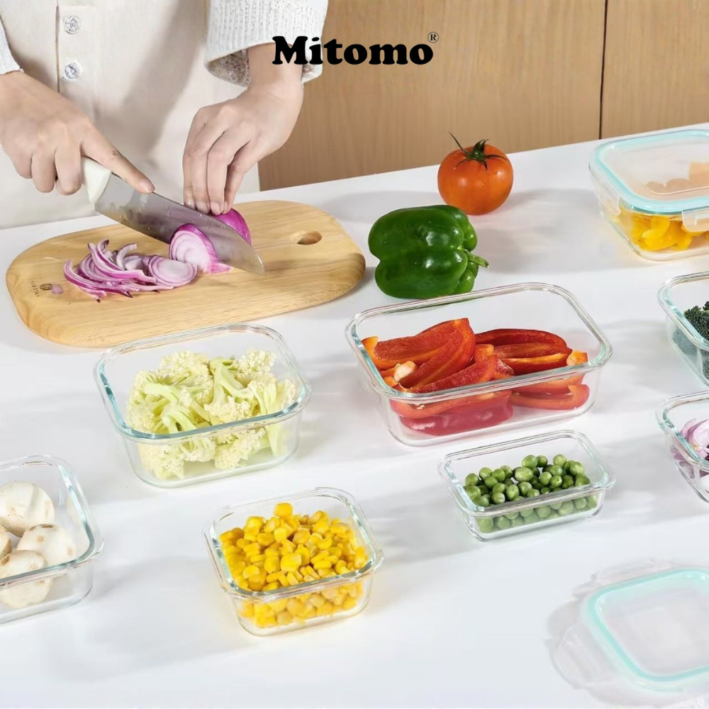 Bộ 3 hộp bảo quản thuỷ tinh hình chữ nhật Mitomo nắp trong suốt được dùng để lưu trữ, bảo quản thực phẩm khô, thực phẩm tươi sống hay thực phẩm chín.