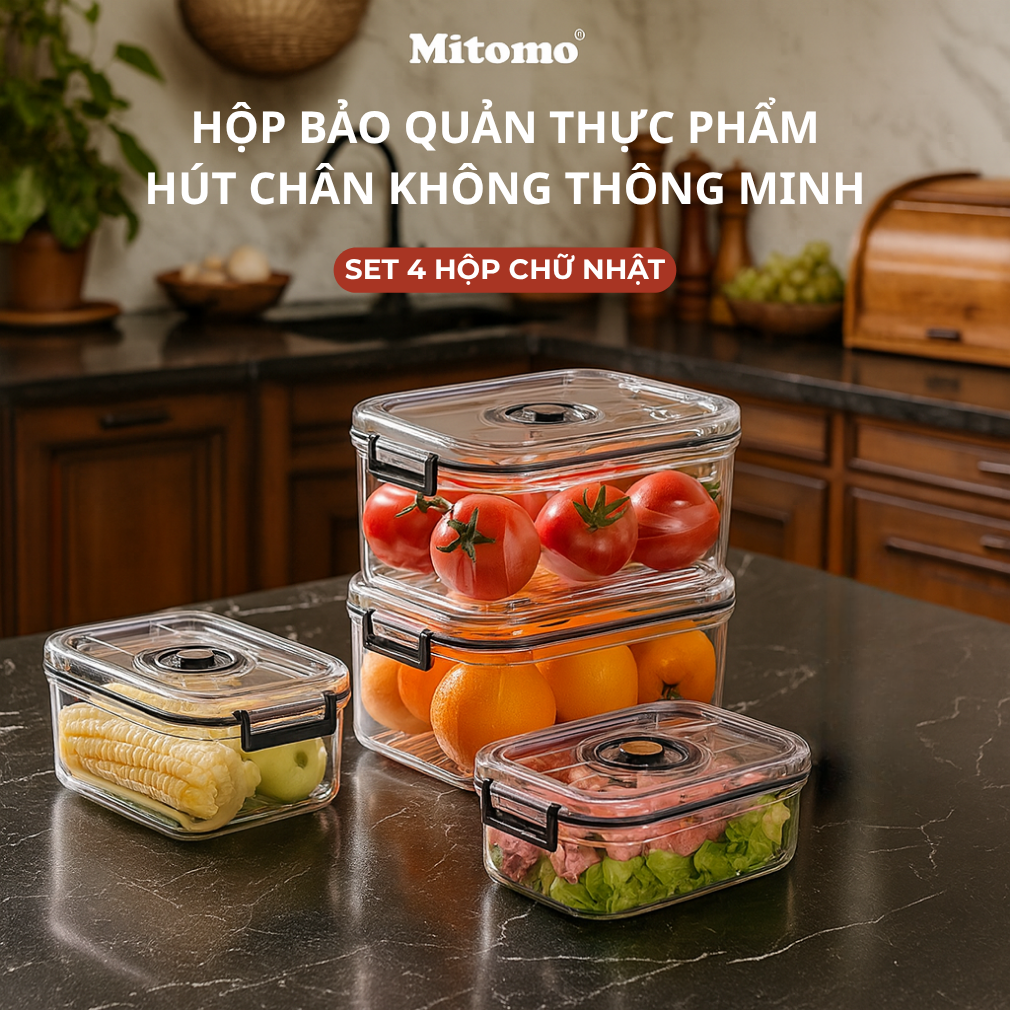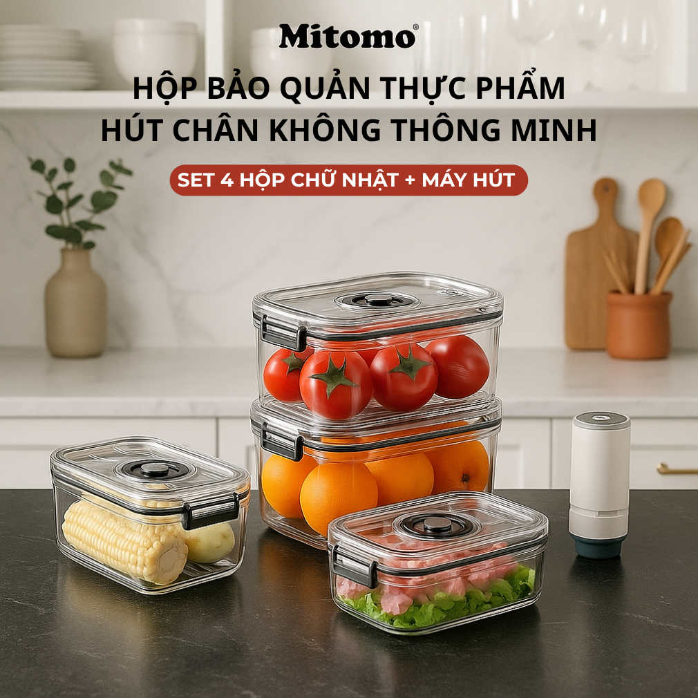 Bộ 4 Hộp Bảo Quản Thực Phẩm Hút Chân Không Thông Minh Mitomo – Tươi Lâu Gấp 3 Lần