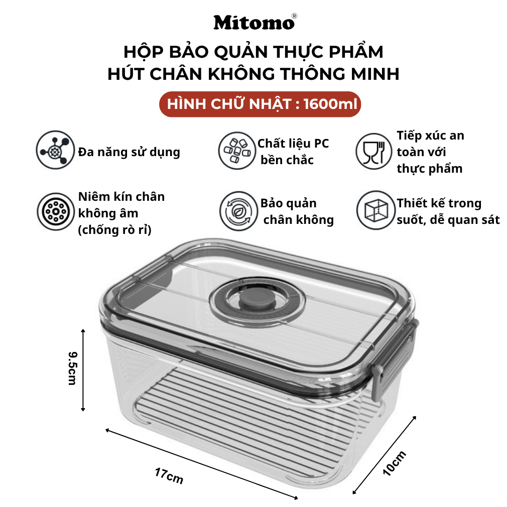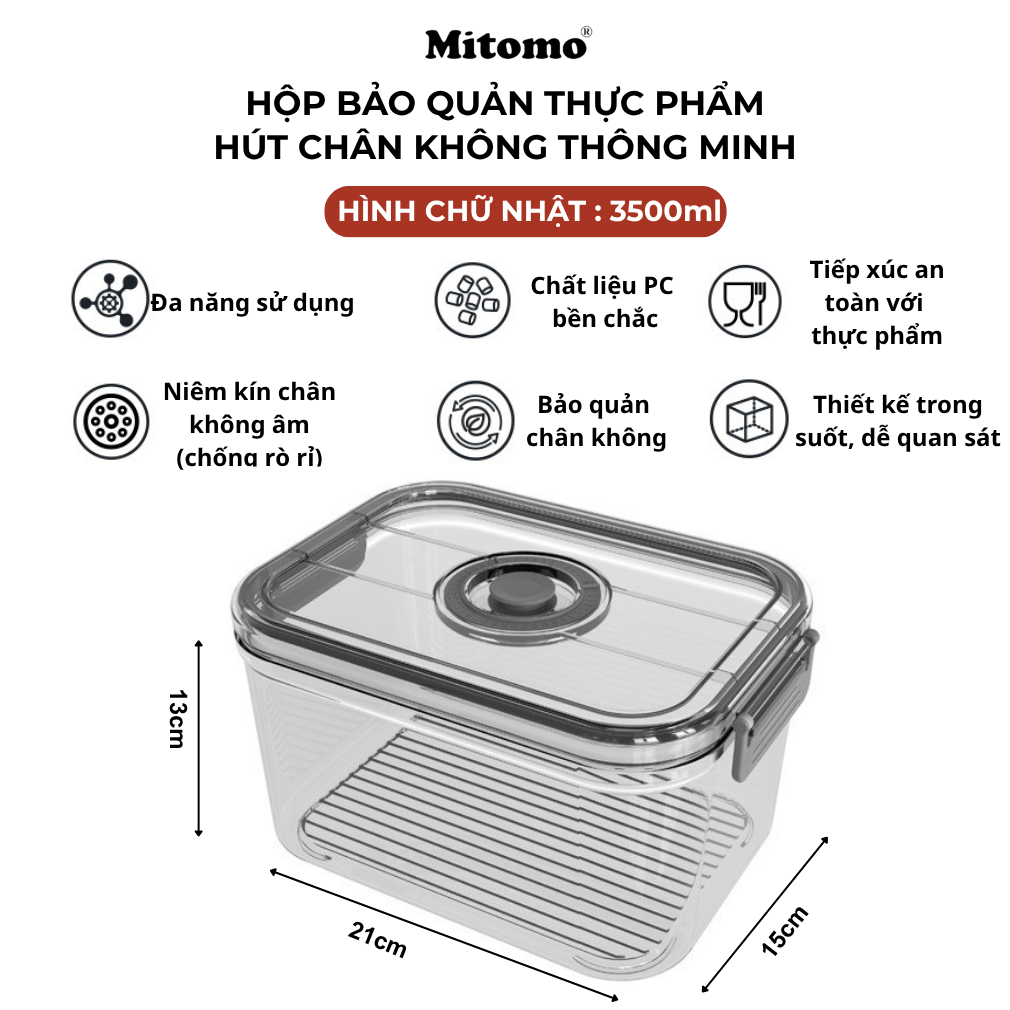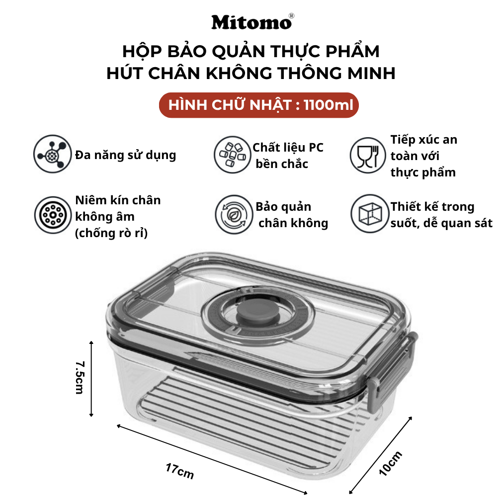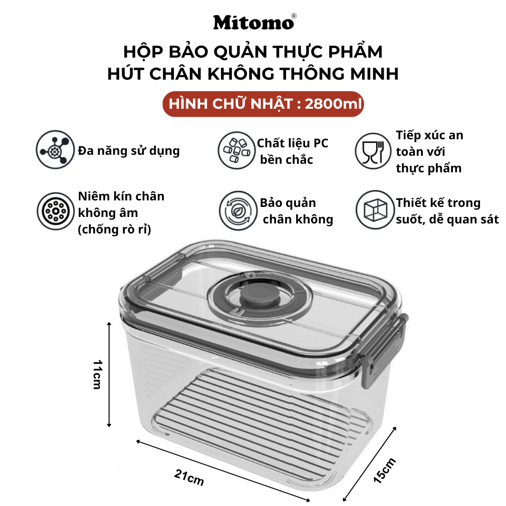 Hộp bảo quản thực phẩm hút chân không Mitomo có thể sử dụng linh hoạt để bảo quản rau củ, trái cây, thịt cá,  đồ khô hay nguyên liệu nấu ăn hằng ngày. Phù hợp cho sử dụng trong gian bếp của mỗi gia đình…