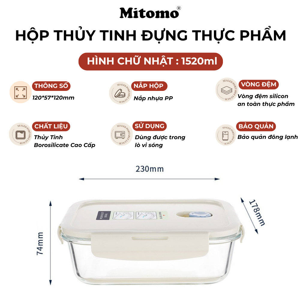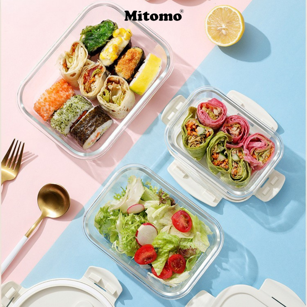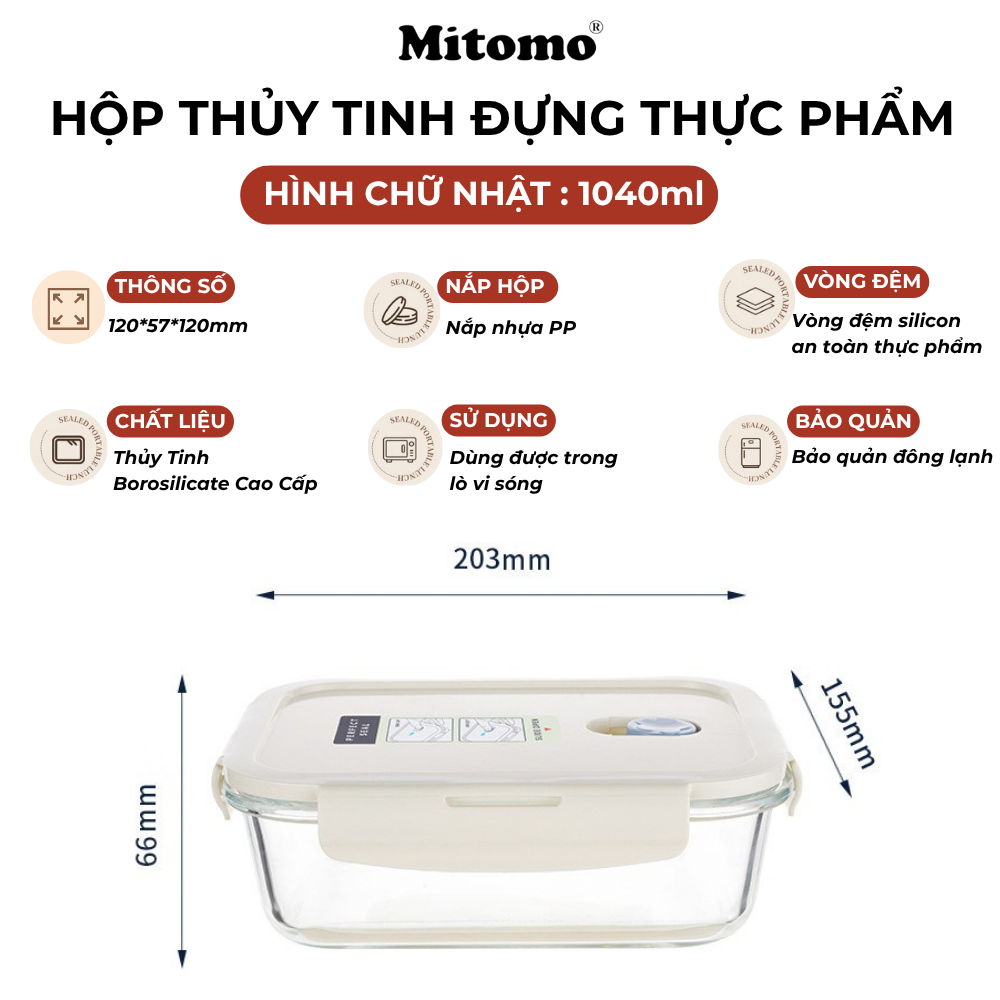 Hộp thuỷ tinh đựng thực phẩm hình chữ nhật Mitomo có thể dùng để lưu trữ, bảo quản thực phẩm khô, thực phẩm tươi sống hay thực phẩm chín.