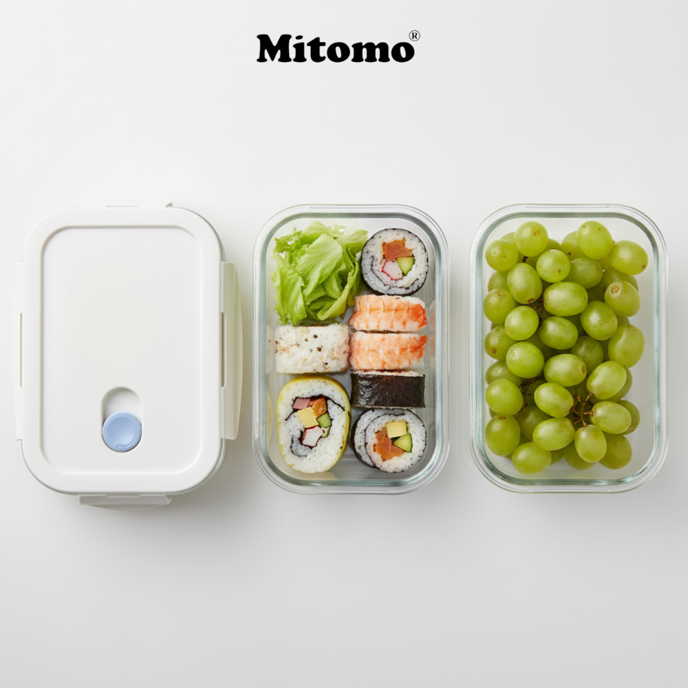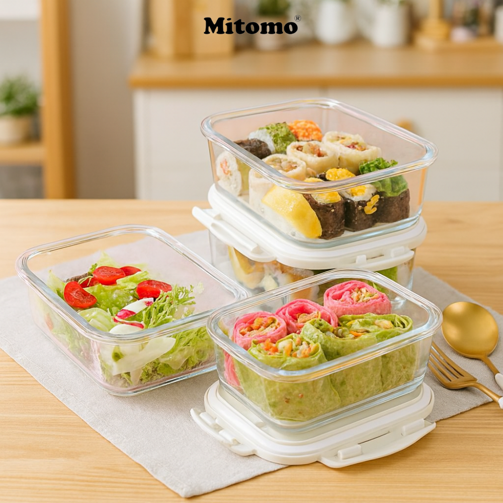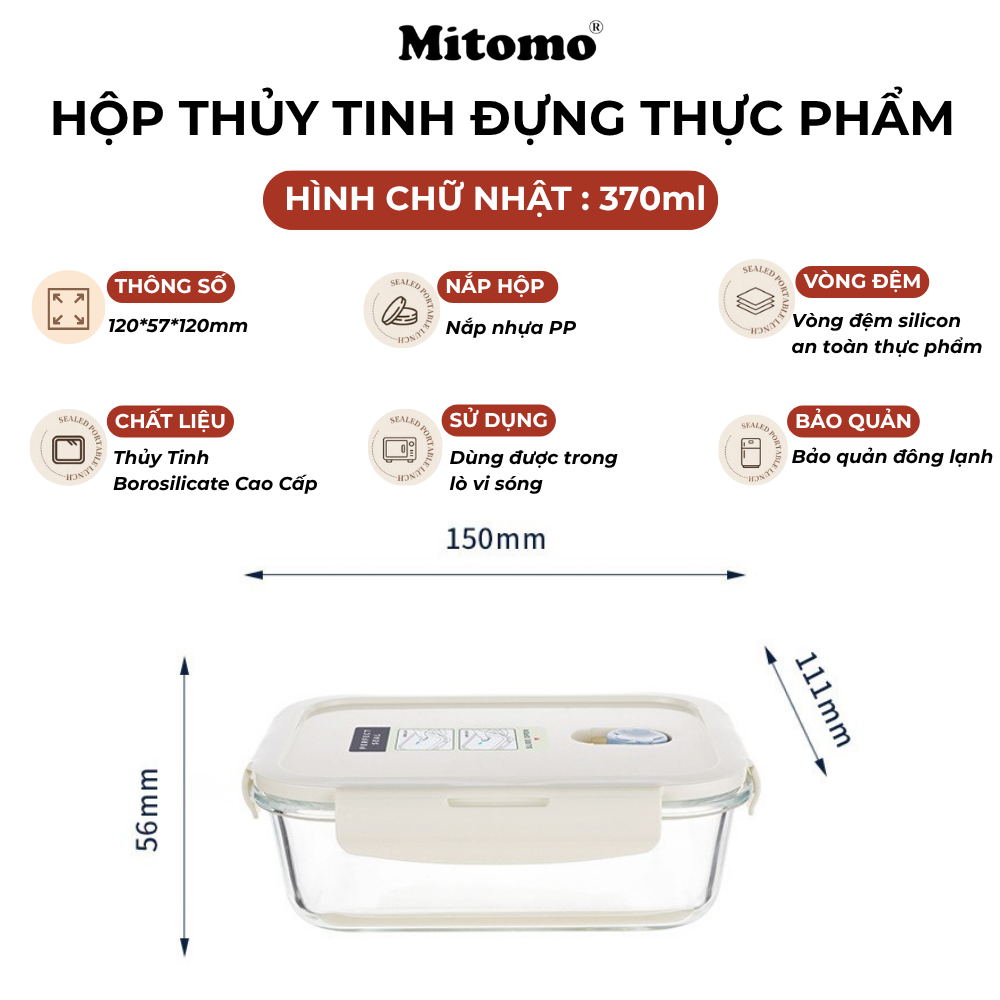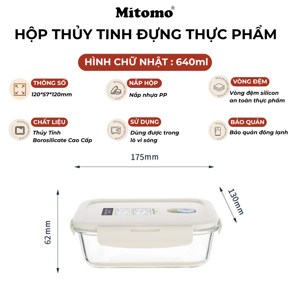 Hộp thuỷ tinh đựng thực phẩm hình chữ nhật Mitomo có thể dùng để lưu trữ, bảo quản thực phẩm khô, thực phẩm tươi sống hay thực phẩm chín.