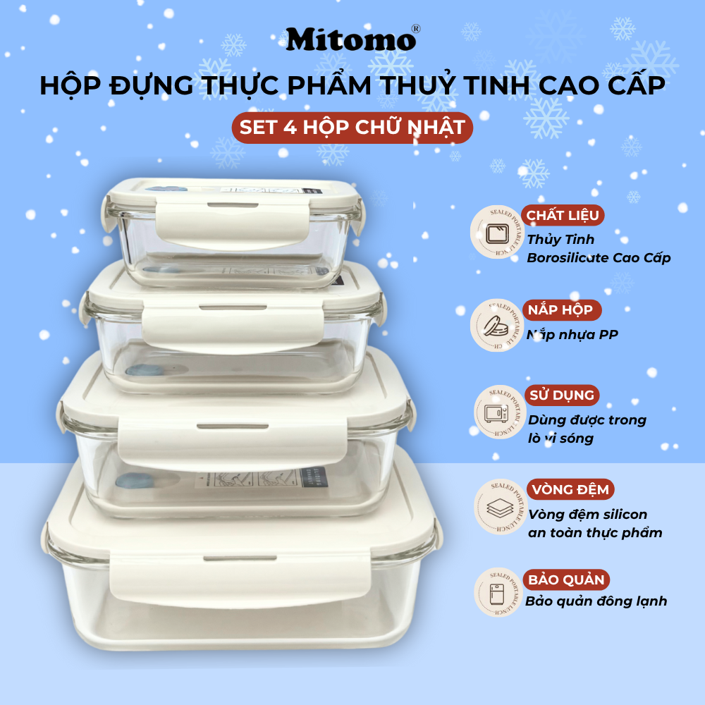 THÔNG SỐ KỸ THUẬT BỘ 4 HỘP THUỶ TINH ĐỰNG THỰC PHẨM MITOMO HÌNH CHỮ NHẬT