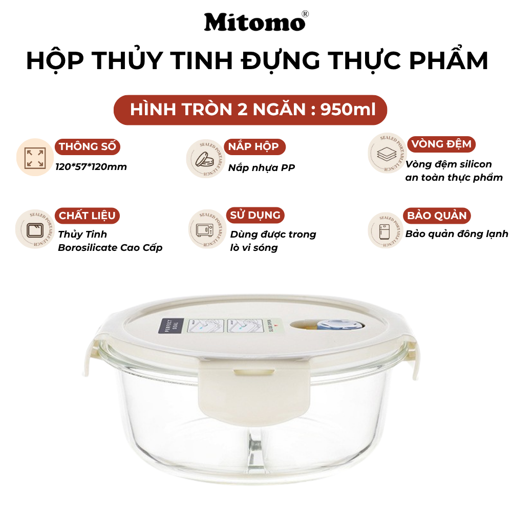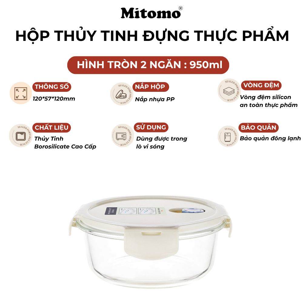 Hộp đựng thực phẩm hình tròn Mitomo được làm bằng thuỷ tinh Borosilicate cao cấp, dày dặn, chắc chắn.