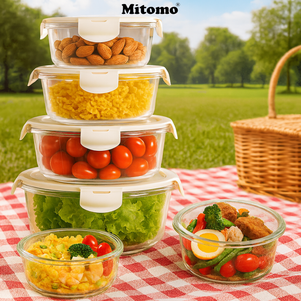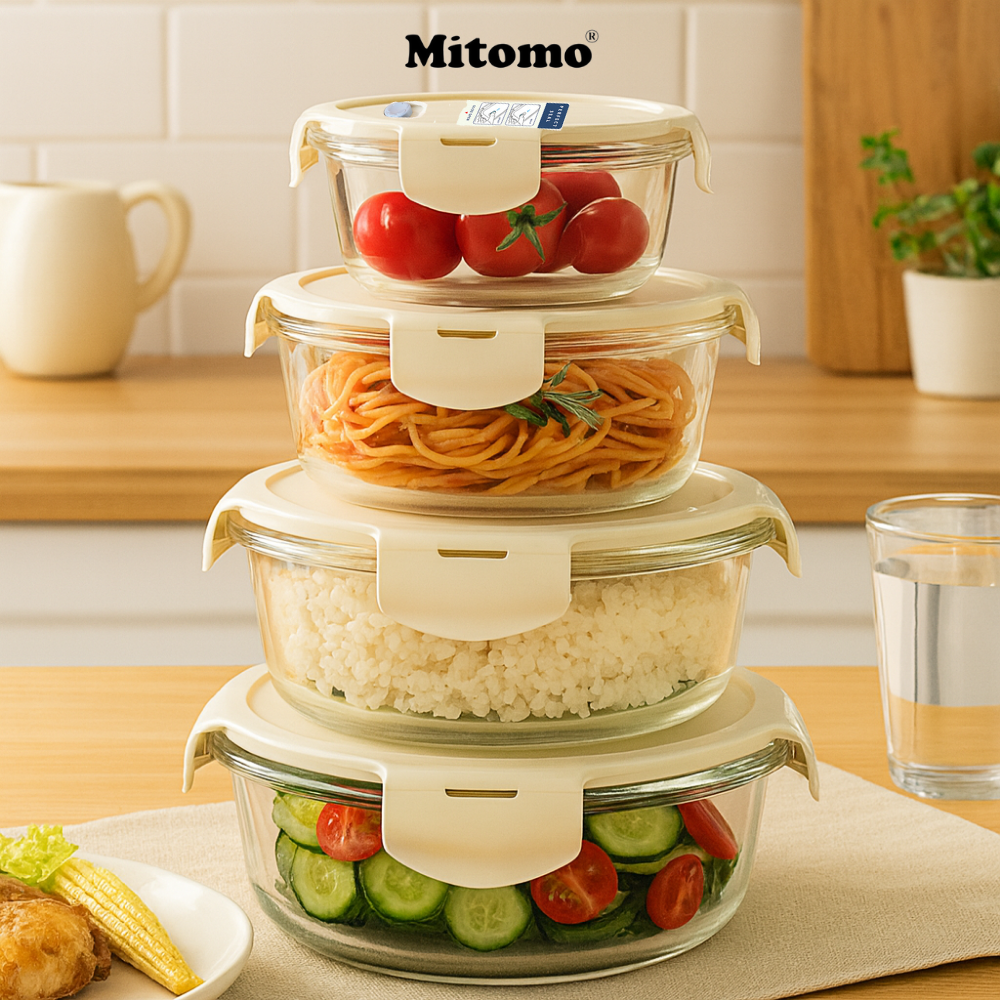 Bộ 4 hộp thuỷ tinh hình tròn Mitomo được dùng để lưu trữ, bảo quản thực phẩm khô, thực phẩm tươi sống hay thực phẩm chín.