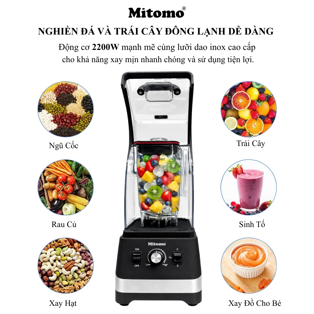 Máy xay sinh tố công nghiệp cao cấp Mitomo ANS-25801 là dòng máy chuyên dụng cho quán kinh doanh, với kiều dáng hiện đại, sang trọng, xay đá siêu mịn, chống ồn hiệu quả.