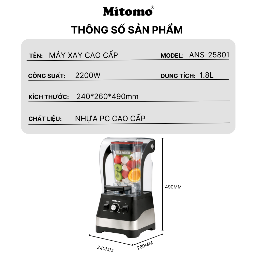 Mitomo ANS-25801 là dòng máy xay sinh tố công nghiệp cao cấp có hộp chống ồn, được thiết kế chuyên biệt cho quán cafe – sinh tố – trà sữa – nước ép cần xay đá thường xuyên nhưng vẫn đảm bảo vận hành êm ái – bền bỉ – ổn định lâu dài.