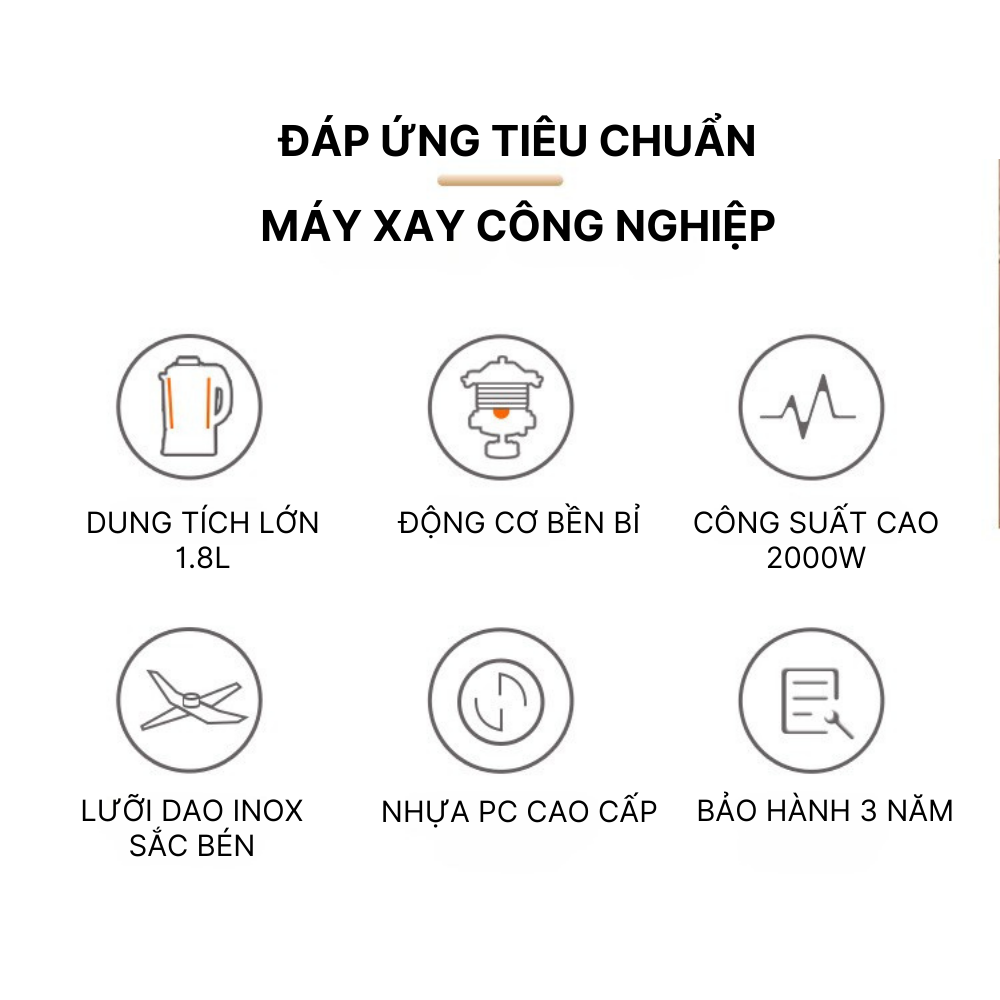 Chất liệu: Động cơ lõi đồng 100%; Lưỡi dao inox 304 không gỉ; Thân bọc nhựa PC cao cấp; Cối nhựa PC cấp thực phẩm