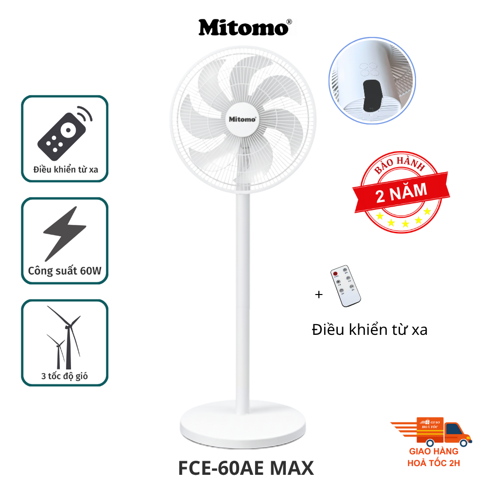 Model: FCE-60AE Màu sắc: Trắng Thương hiệu: Mitomo Xuất xứ thương hiệu: Việt Nam Điện áp: 220V/50Hz Hẹn giờ tắt/mở: 8 tiếng Tốc độ gió: 3 tốc độ Kích thước: Chiều cao: 113; Đường kính lồng quạt: 38cm Chất liệu: Nhựa ABS cao cấp Công suất: 60W Trọng lượng: 4.5kg Bảo hành: 24 tháng